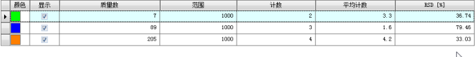 以1×10-2 mg/L Be、In、Bi、混合溶液進(jìn)樣,測量質(zhì)量數(shù)9,115,209處的離子計數(shù),在20min內(nèi),每2min取一個數(shù)據(jù),重復(fù)測量不少于10個數(shù)據(jù),計算相對標(biāo)準(zhǔn)偏差RSD,即為儀器短期穩(wěn)定性。