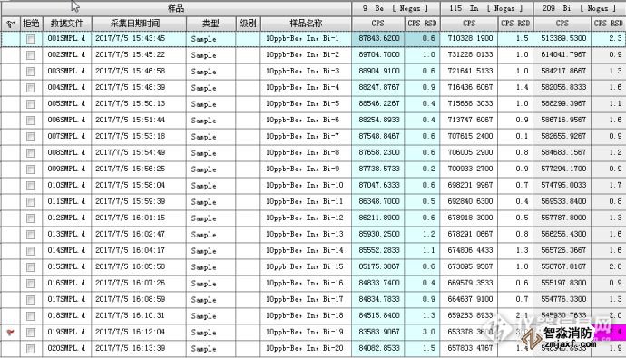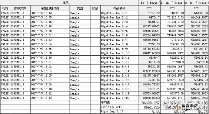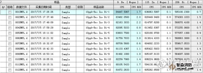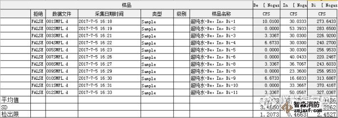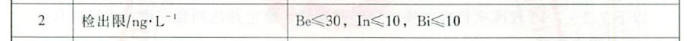 以18M Ω.cm的超純水進(jìn)樣,測量測量質(zhì)量數(shù)9,115,209處的離子計數(shù),積分時間0.1s,分別測量11個數(shù)據(jù),用測量結(jié)果的標(biāo)準(zhǔn)偏差SA的3倍除以Be、In、Bi的寧明的S,結(jié)果即為各元素的檢出限,CL=3SA/S。