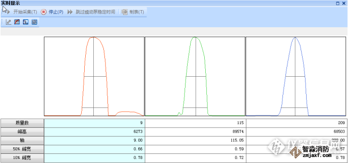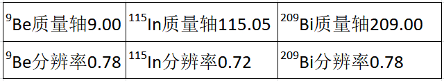 分辨率:以1×10-2 mg/L Be、In、Bi、混合溶液進(jìn)樣,打印質(zhì)量數(shù)9,115,209的譜圖,并計算10%峰高處的峰寬度。