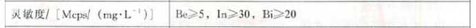 以1×10-2 mg/L Be、In、Bi、混合溶液進(jìn)樣,測量質(zhì)量數(shù)9,115,209處的離子計數(shù),積分時間0.1s,分別測量20個數(shù)據(jù),取其平均值,在除以其準(zhǔn)確濃度值,即為個元素的靈敏度S。