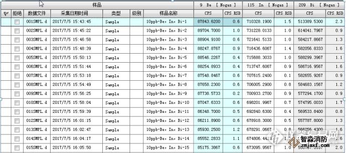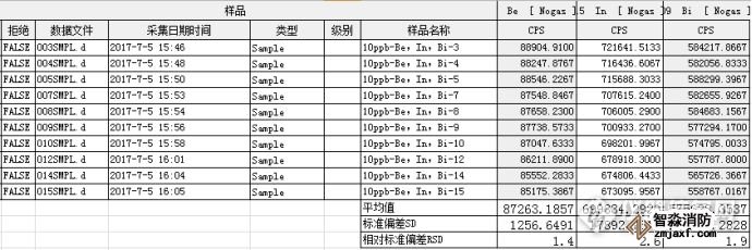 實測指標(biāo)RSD:Be =1.6%,In =1.9%,Bi= 1.3%